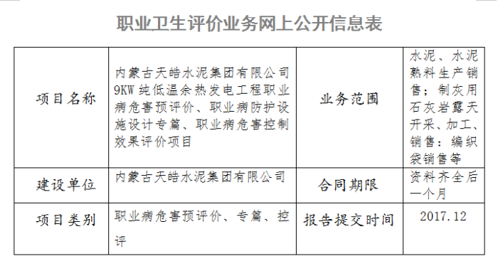 1、內(nèi)蒙古天皓水泥集團(tuán)有限公司9KW純低溫余熱發(fā)電工程職業(yè)病危害預(yù)評(píng)價(jià)、專篇、控制效果評(píng)價(jià)項(xiàng)目