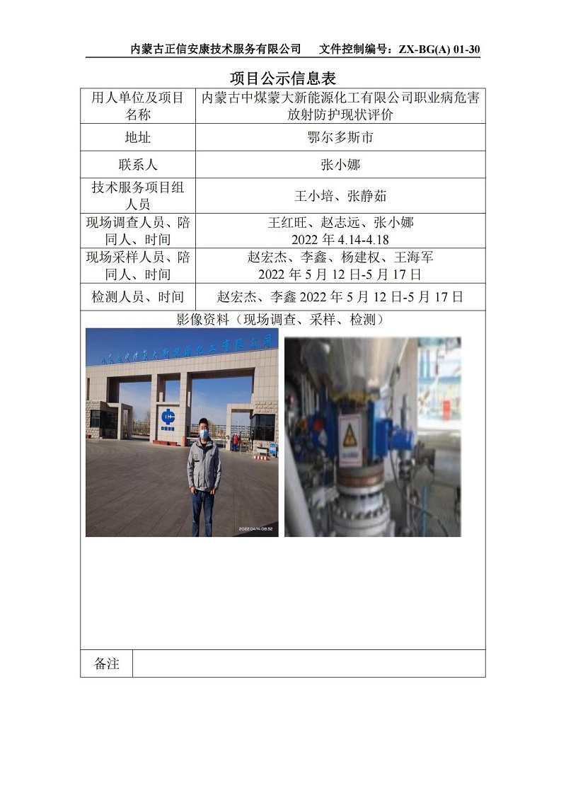 內蒙古中煤蒙大新能源化工有限公司職業(yè)病危害放射防護現(xiàn)狀評價公示信息表