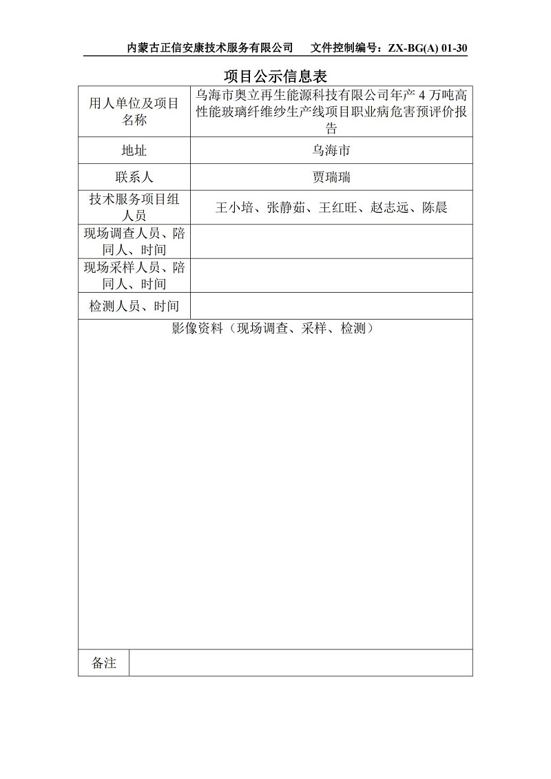 烏海市奧立再生能源科技有限公司年產(chǎn)4萬噸高性能玻璃纖維紗生產(chǎn)線項(xiàng)目職業(yè)病危害預(yù)評(píng)價(jià)報(bào)告公示信息表