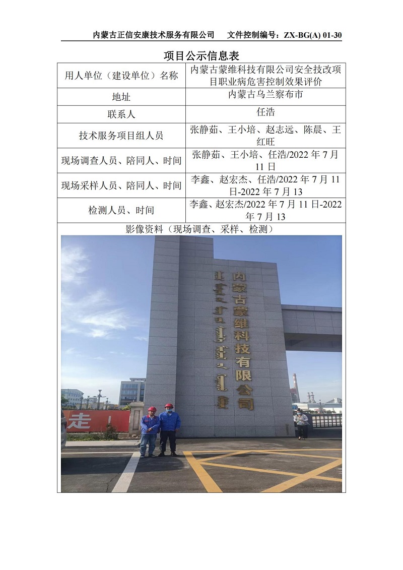 內(nèi)蒙古蒙維科技有限公司安全技改項目職業(yè)病危害控制效果評價項目公示