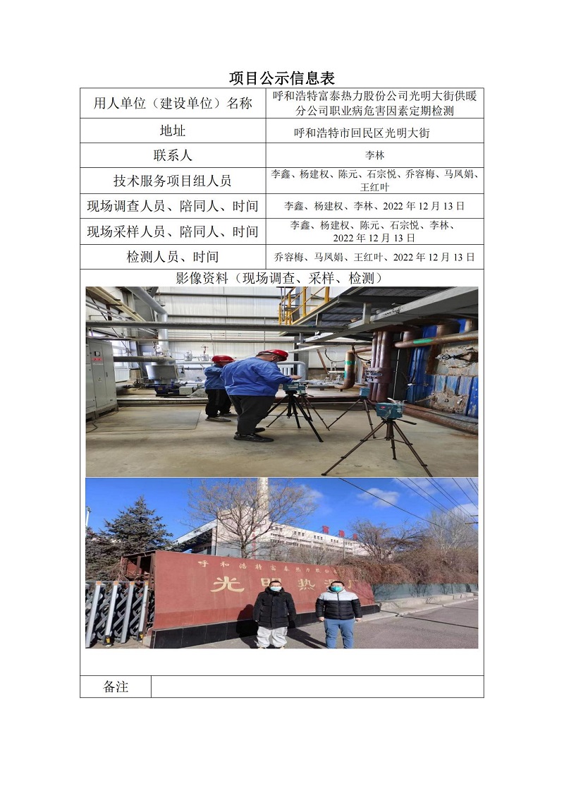 呼和浩特富泰熱力股份公司光明大街供暖分公司定期檢測