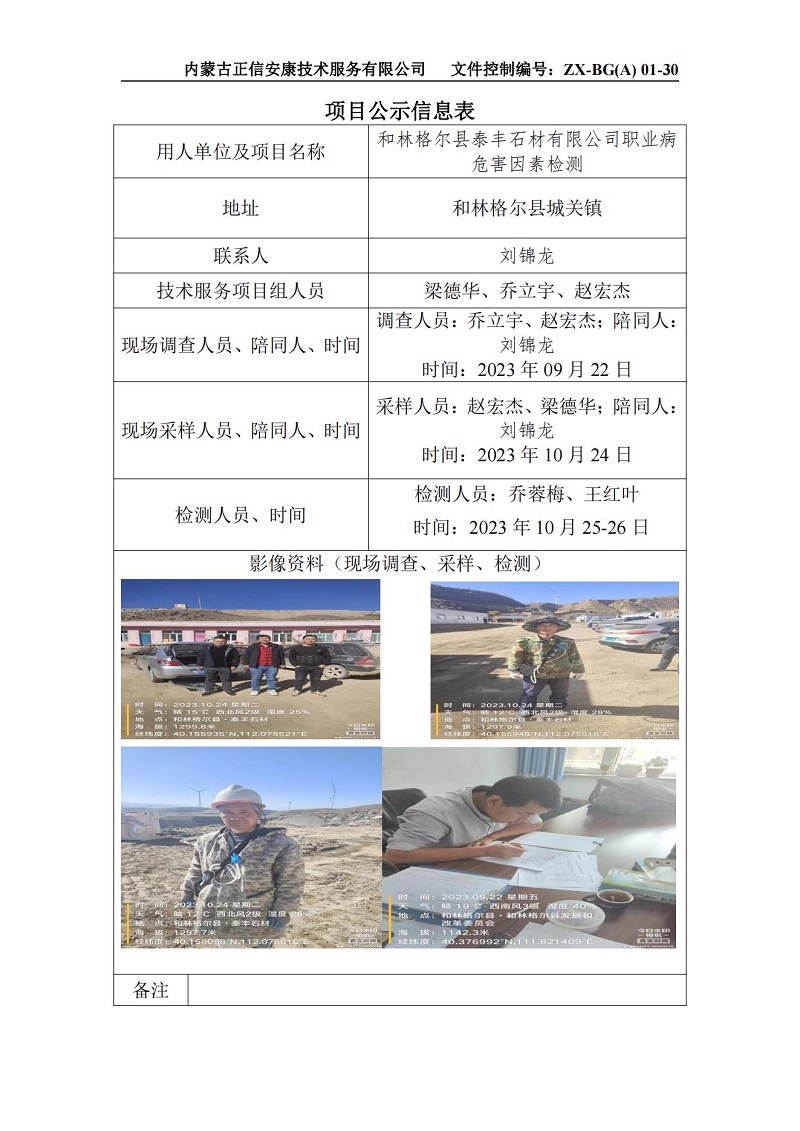 和林格爾縣泰豐石材有限公司職業(yè)病危害因素檢測(cè)項(xiàng)目公示信息表