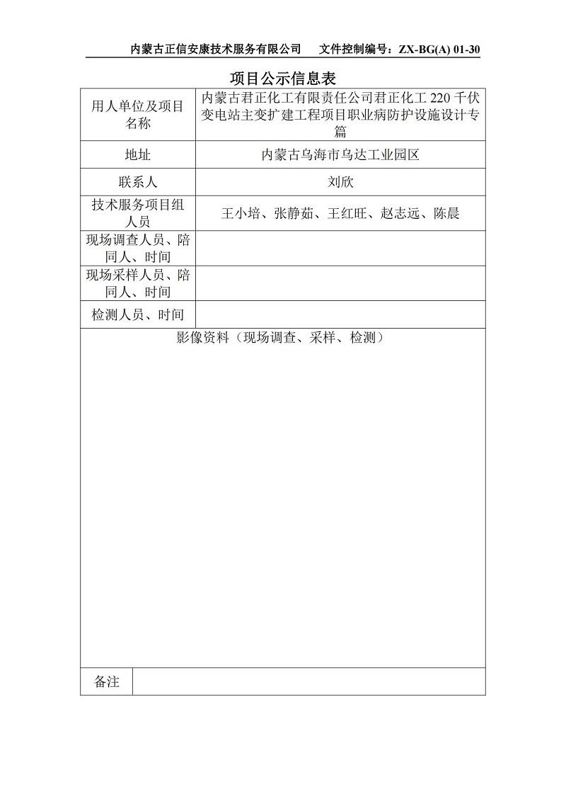內蒙古君正化工有限責任公司君正化工220千伏變電站主變擴建工程項目職業(yè)病防護設施設計專篇項目公示信息表