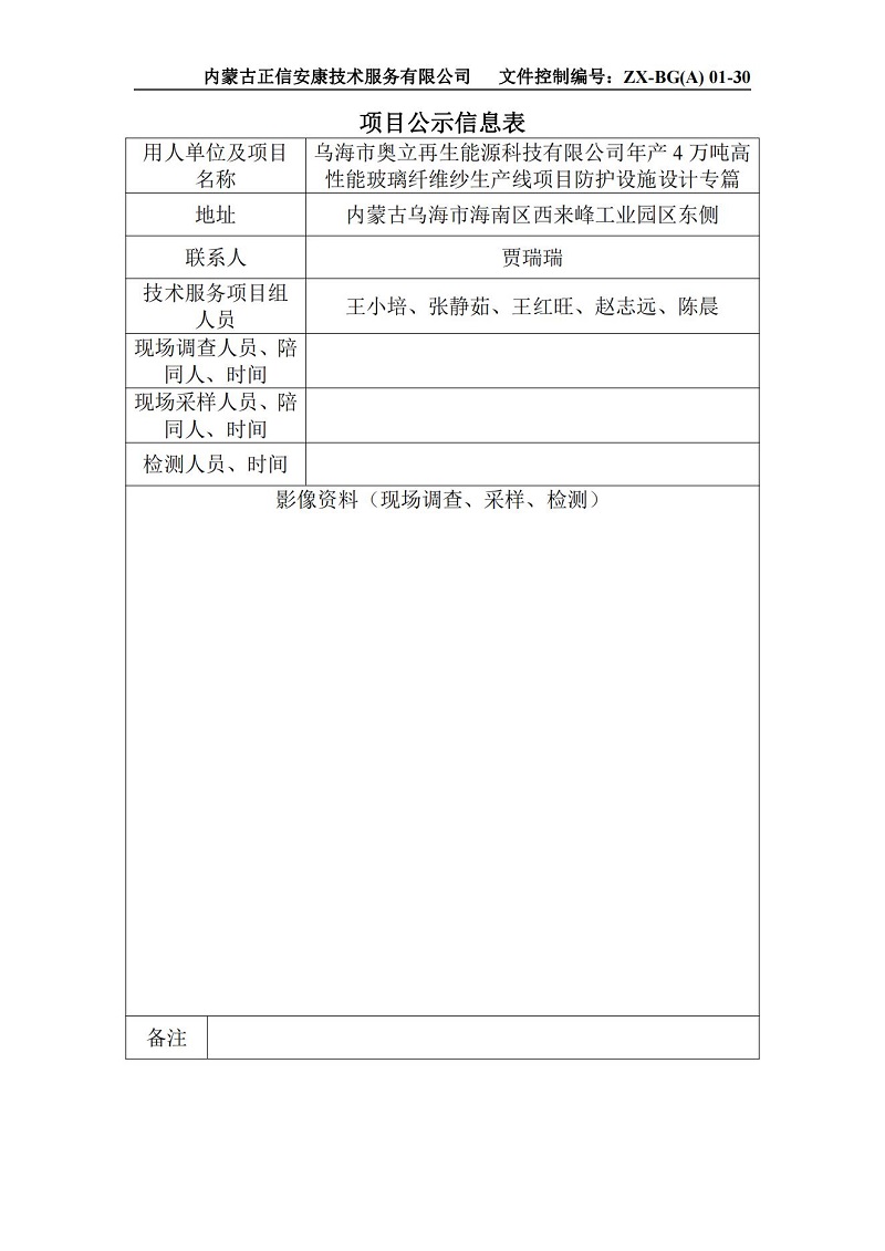 烏海市奧立再生能源科技有限公司年產(chǎn)4萬噸高性能玻璃纖維紗生產(chǎn)線設計專篇項目公示信息表