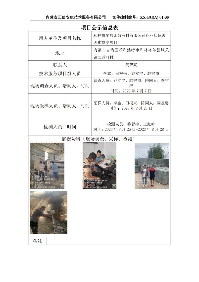 和林格爾縣閩盛石材有限公司職業(yè)病危害因素檢測(cè)項(xiàng)目公示信息表
