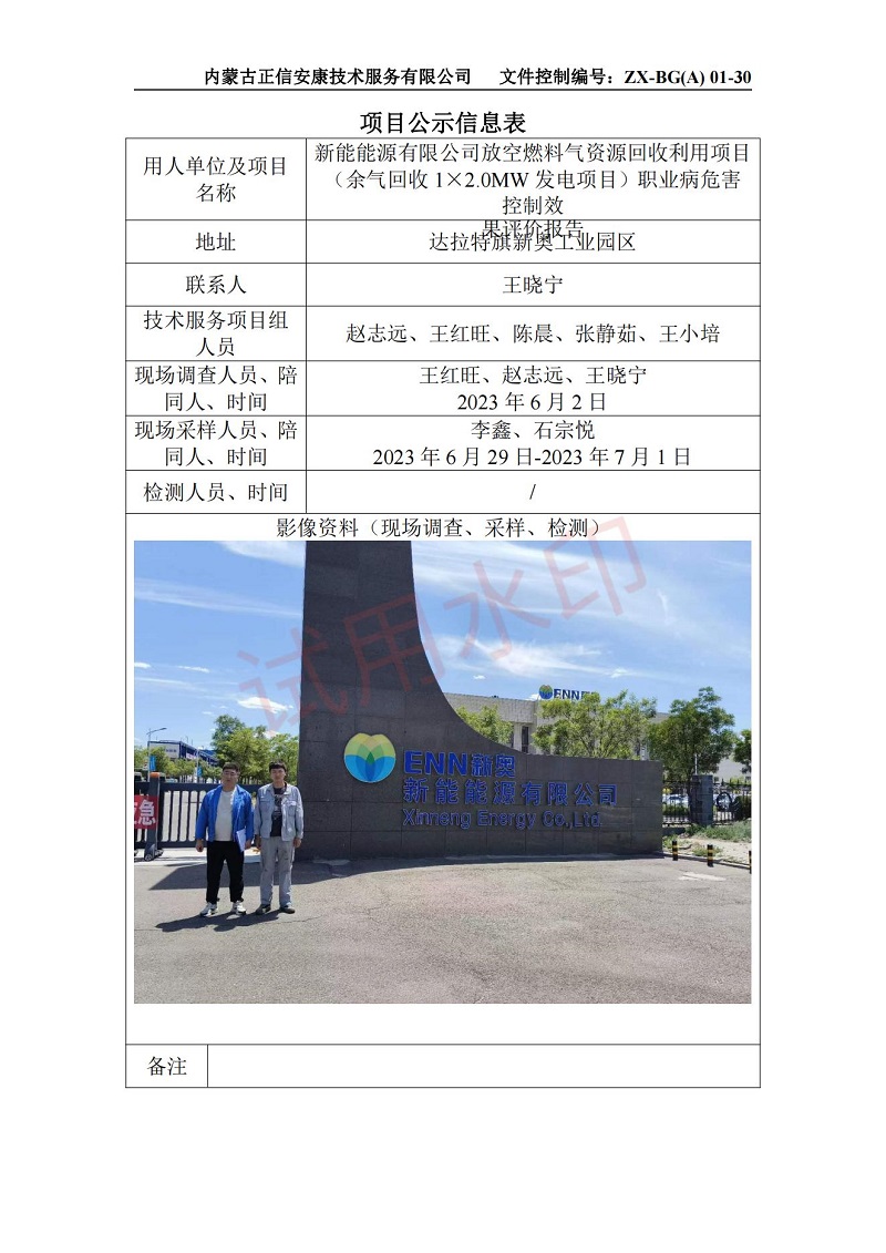 新能能源有限公司放空燃料氣資源回收利用項目(余氣回收1×2.0MW發(fā)電項目)職業(yè)病危害控制效果評價報告-項目公示信息表