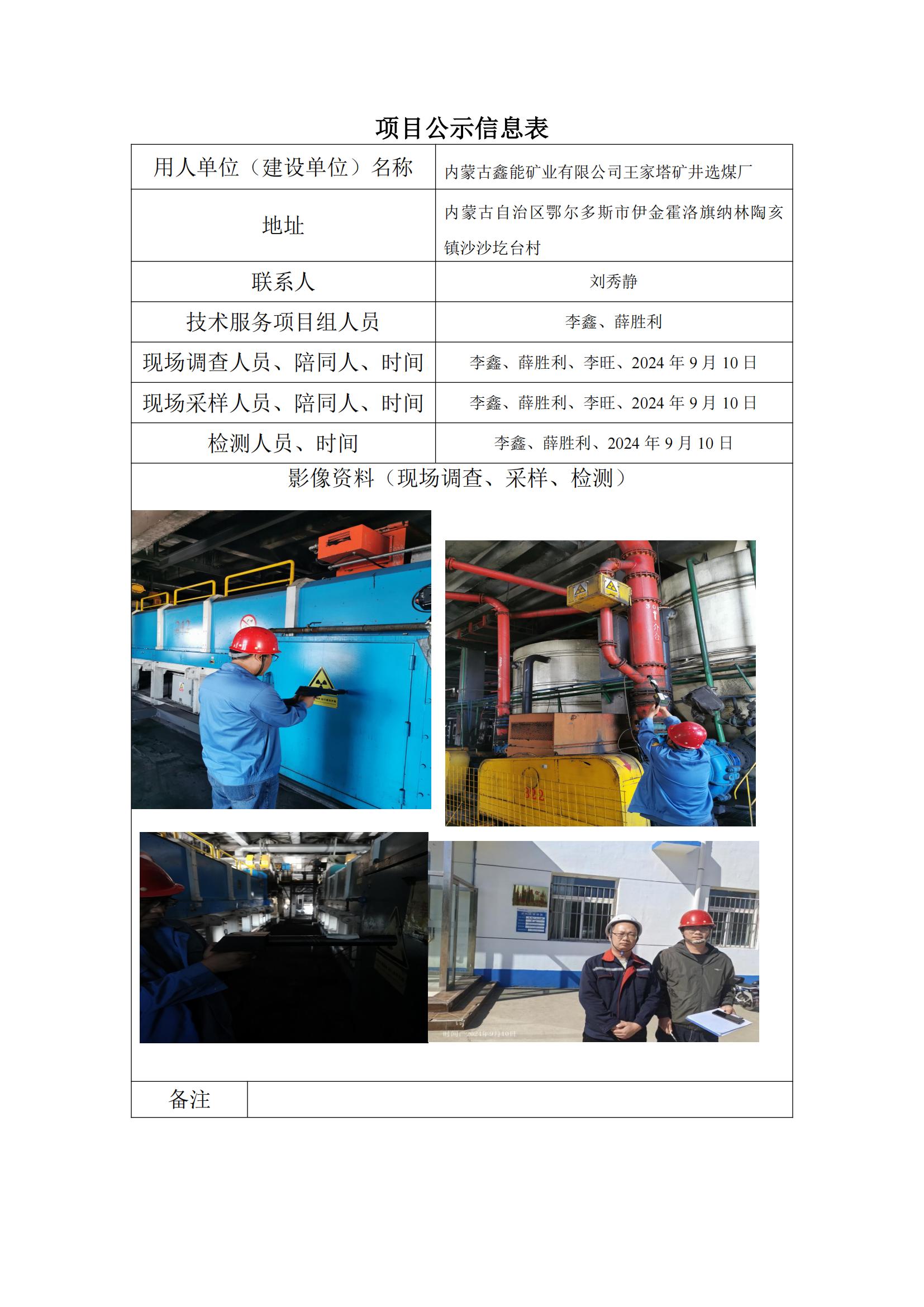 內(nèi)蒙古鑫能礦業(yè)有限公司王家塔礦井選煤廠放射衛(wèi)生防護檢測