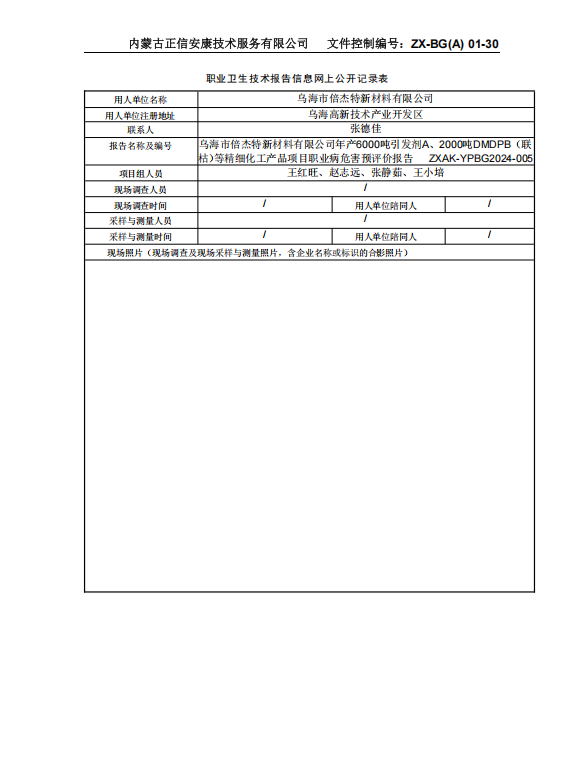 烏海市倍杰特新材料有限公司年產6000噸引發(fā)劑A、2000噸DMDPB(聯(lián) 枯)等精細化工產品項目職業(yè)病危害預評價報告