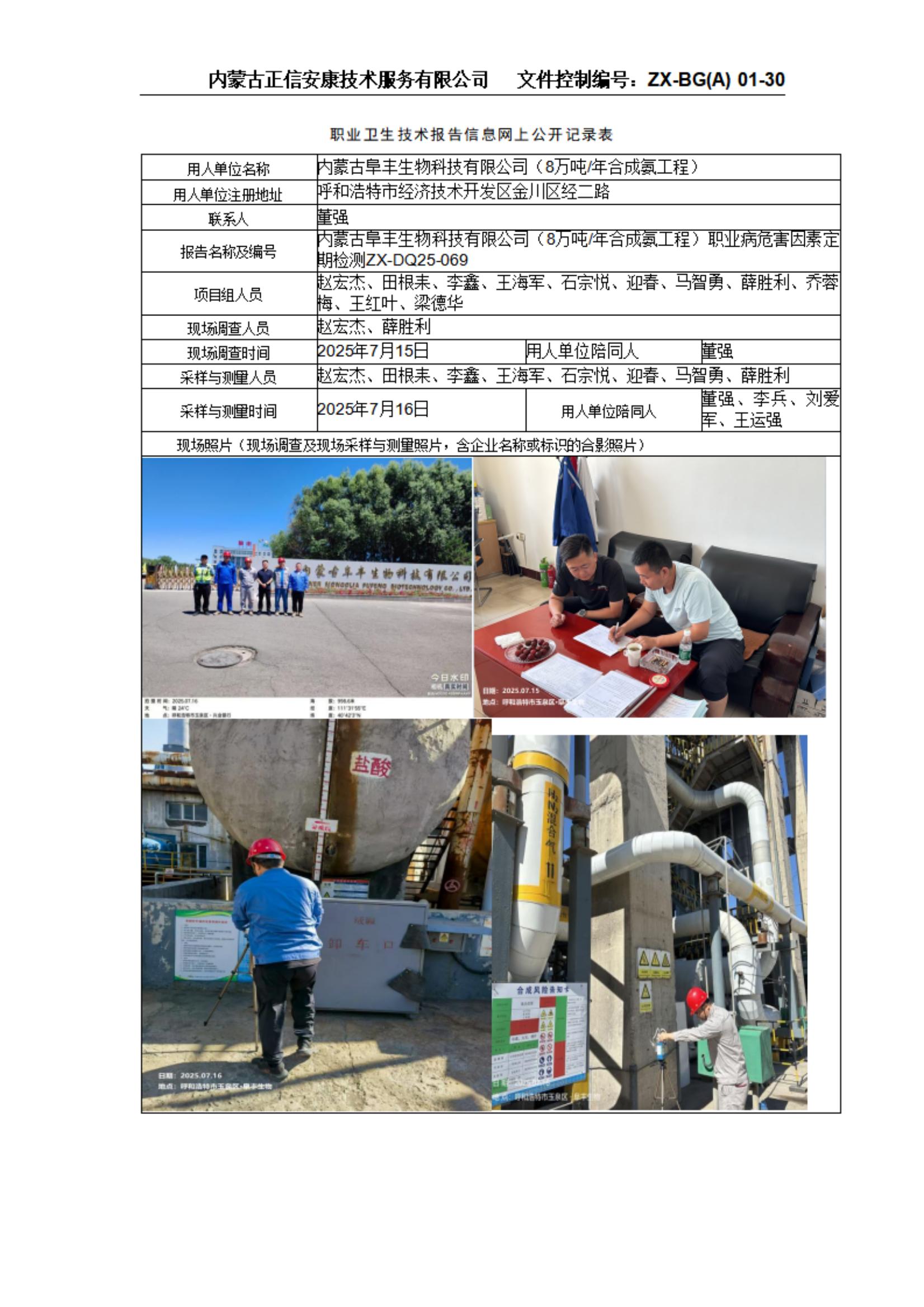內(nèi)蒙古阜豐生物科技有限公司(8萬噸/年合成氨工程)職業(yè)病危害因素定期檢測