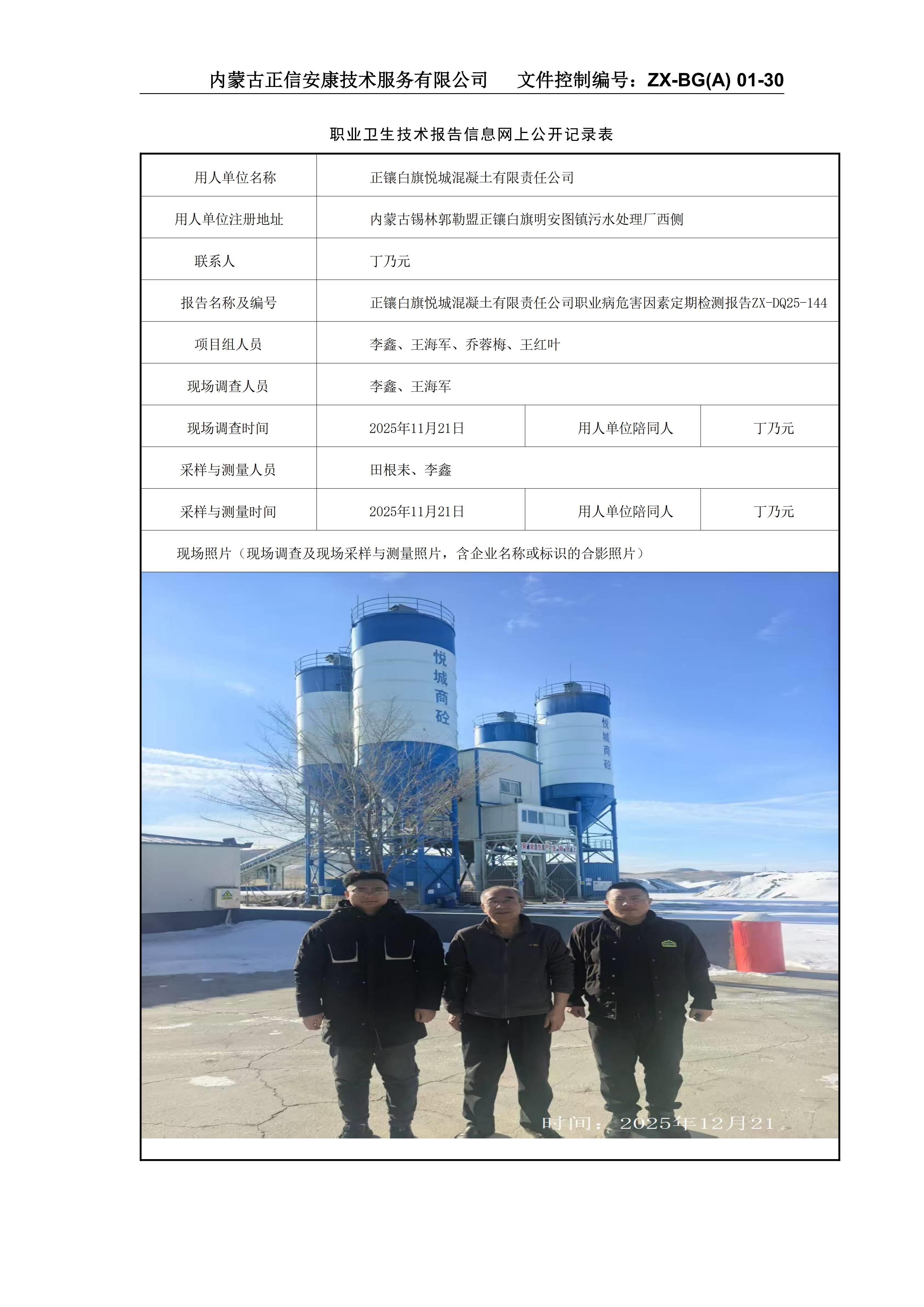 正鑲白旗悅城混凝土有限責(zé)任公司職業(yè)病危害因素定期檢測報告